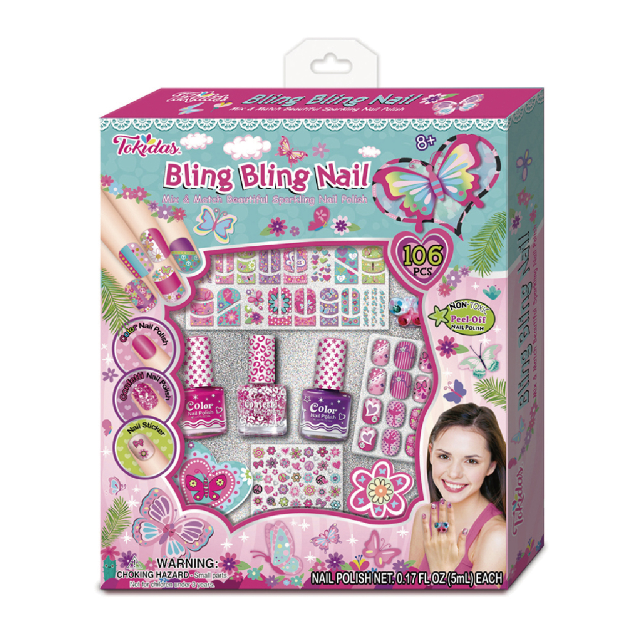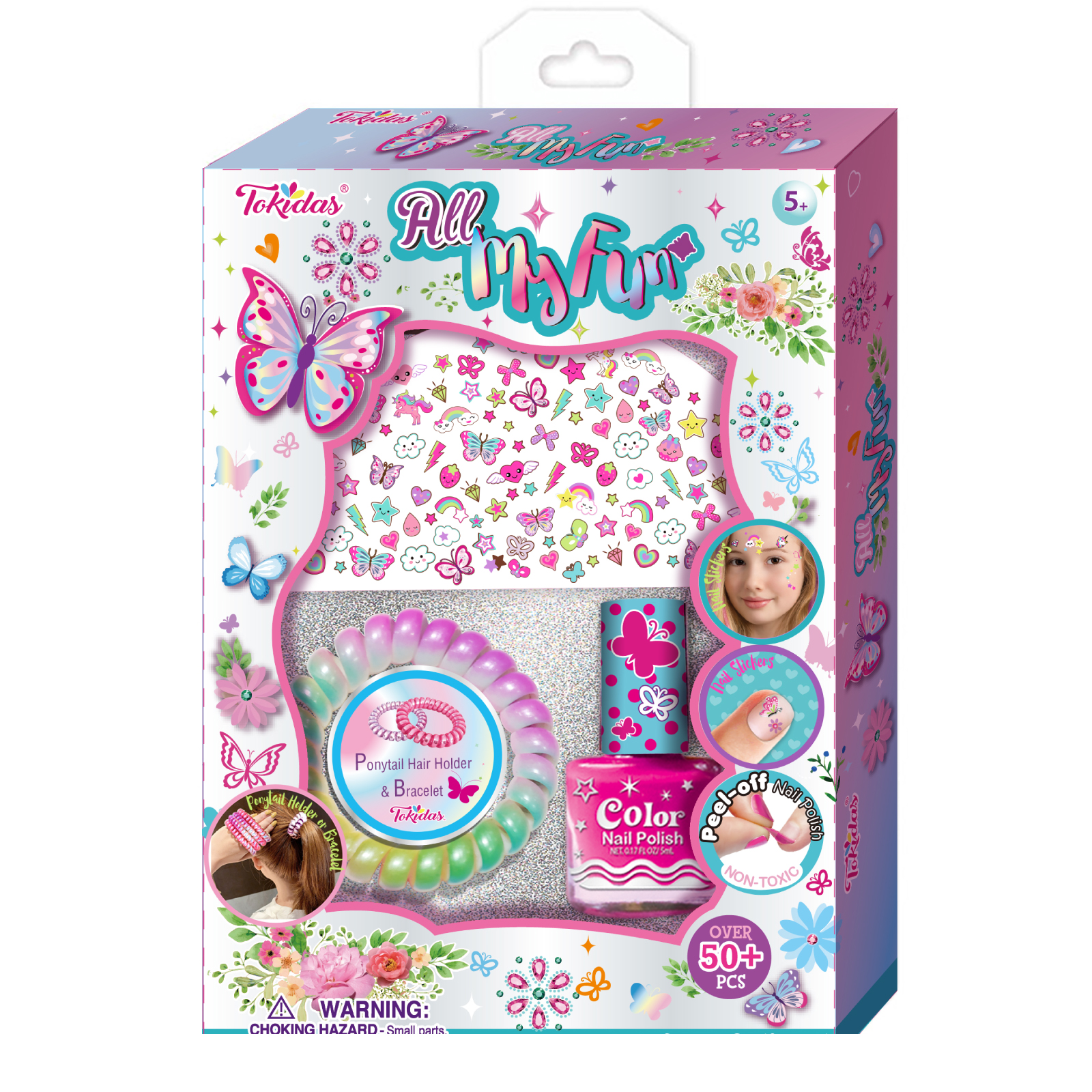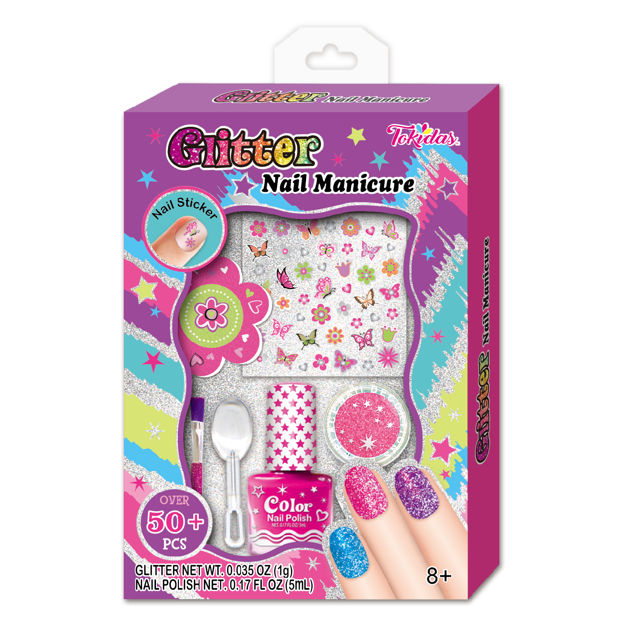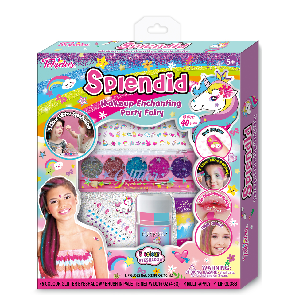 4 Multi-Colored Eyeshadow in Palette, 1 Bottle of Confetti Nail Polish, 3-1 Multi-Functional Glitter, 1 Sheet of Nail Stickers.