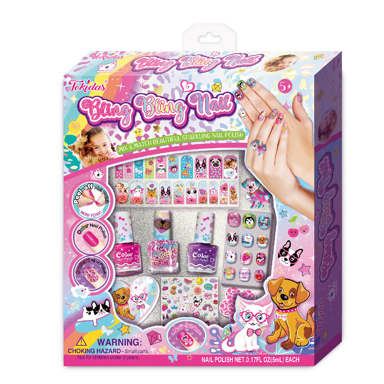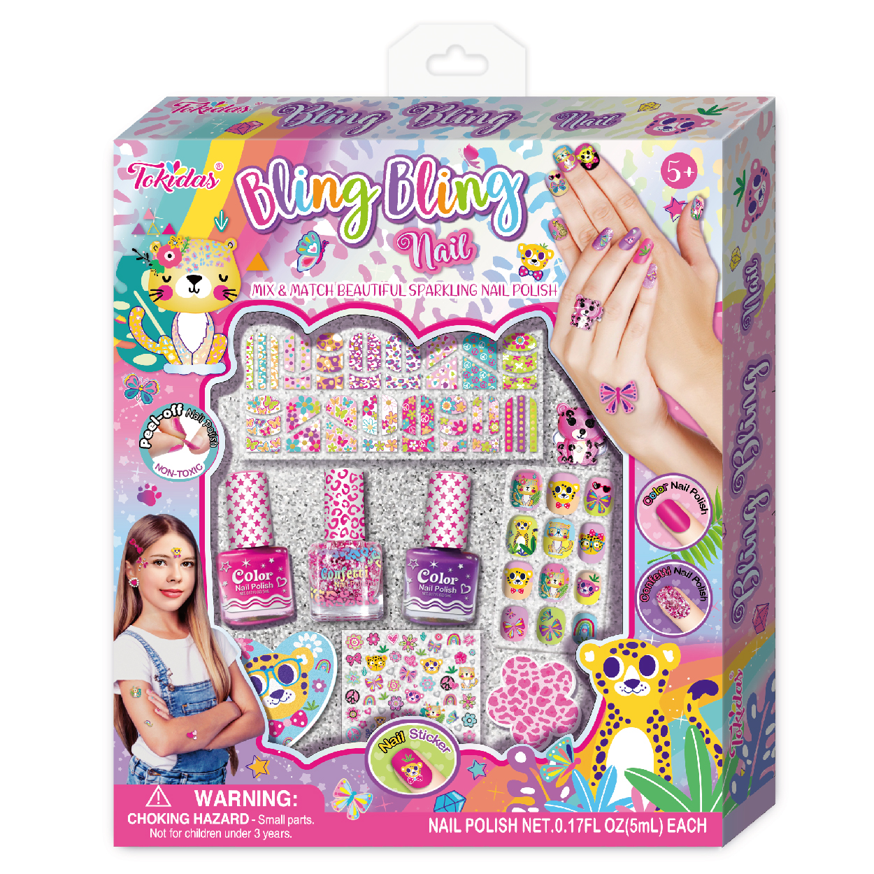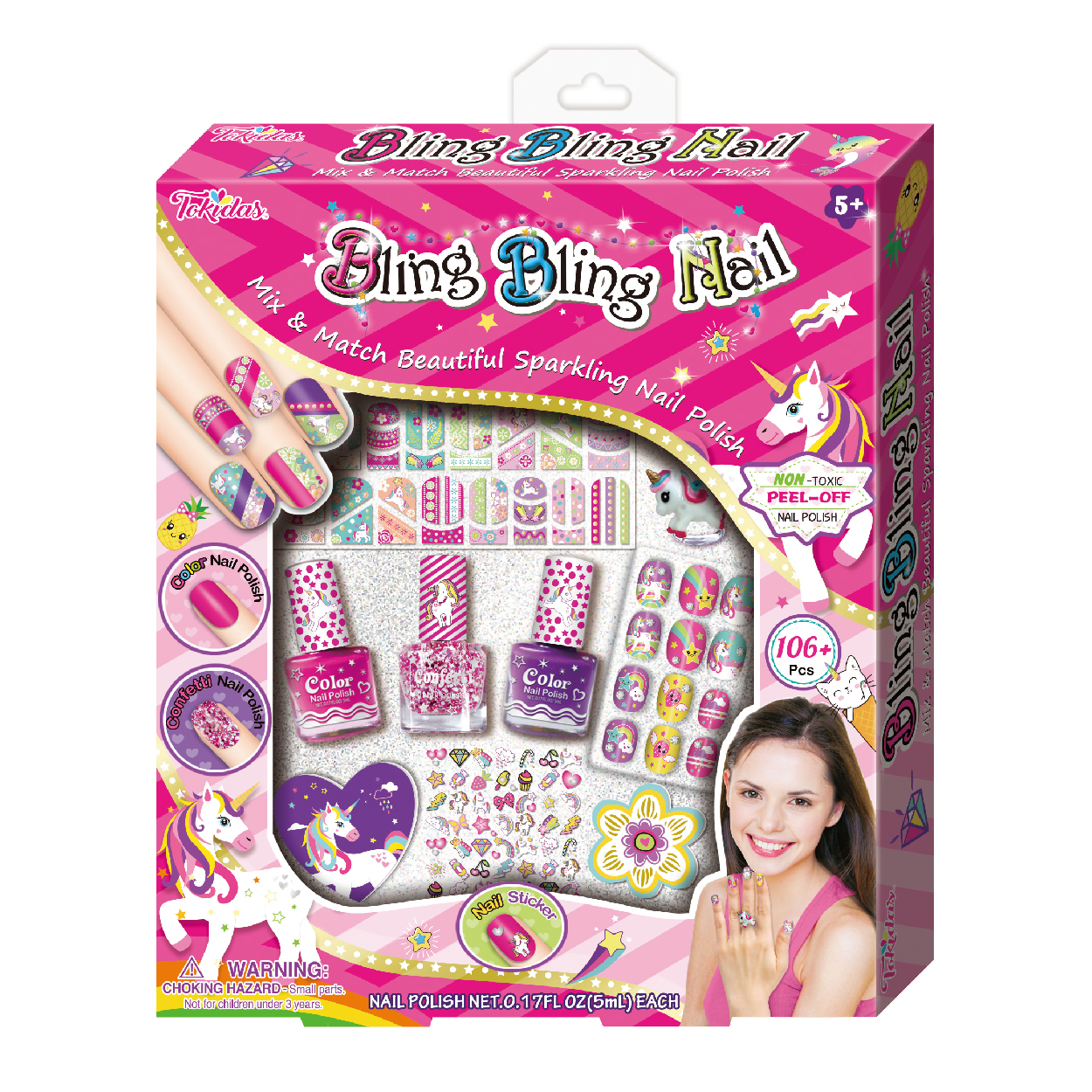 4 Multi-Colored Eyeshadow in Palette, 1 Bottle of Confetti Nail Polish, 3-1 Multi-Functional Glitter, 1 Sheet of Nail Stickers.