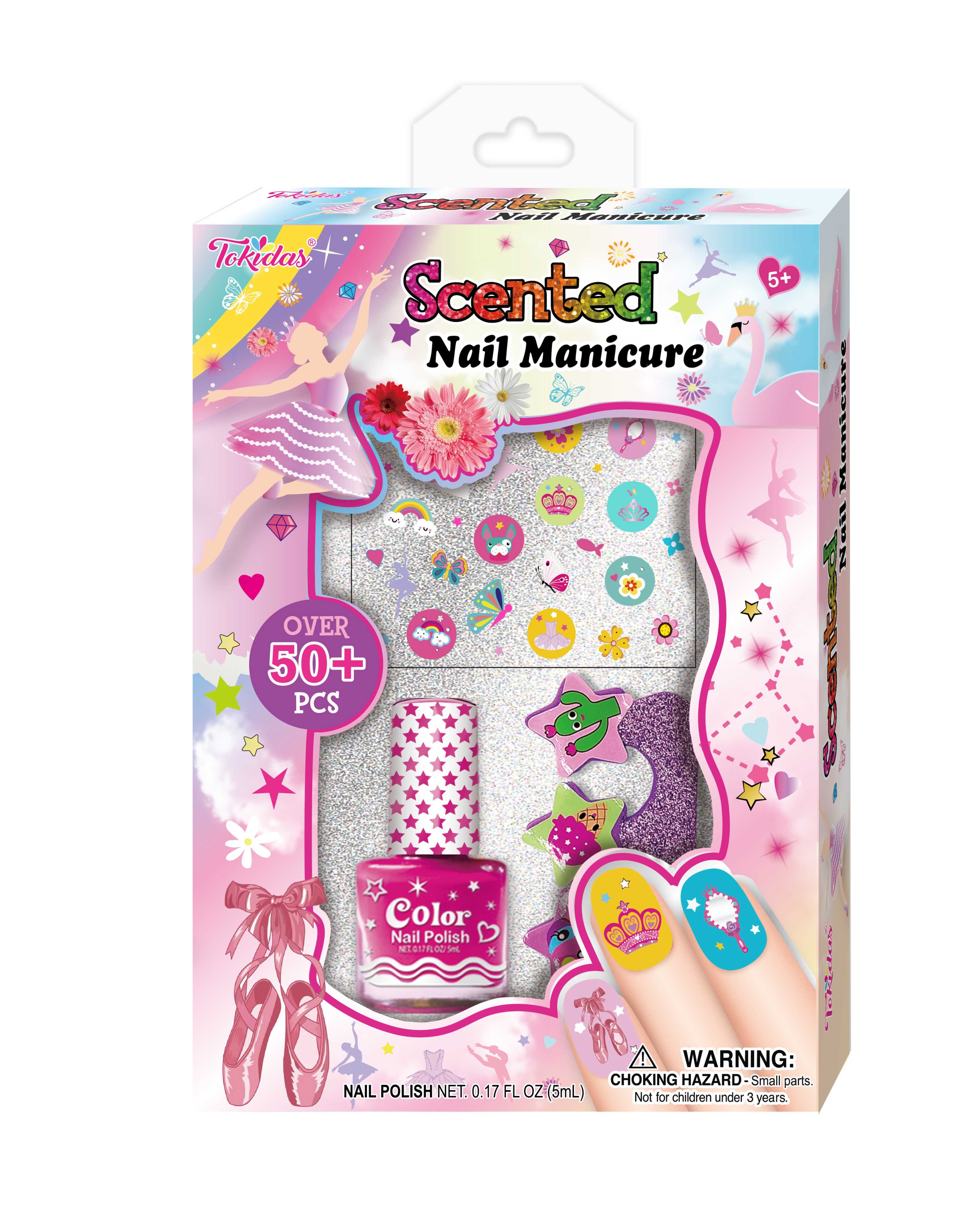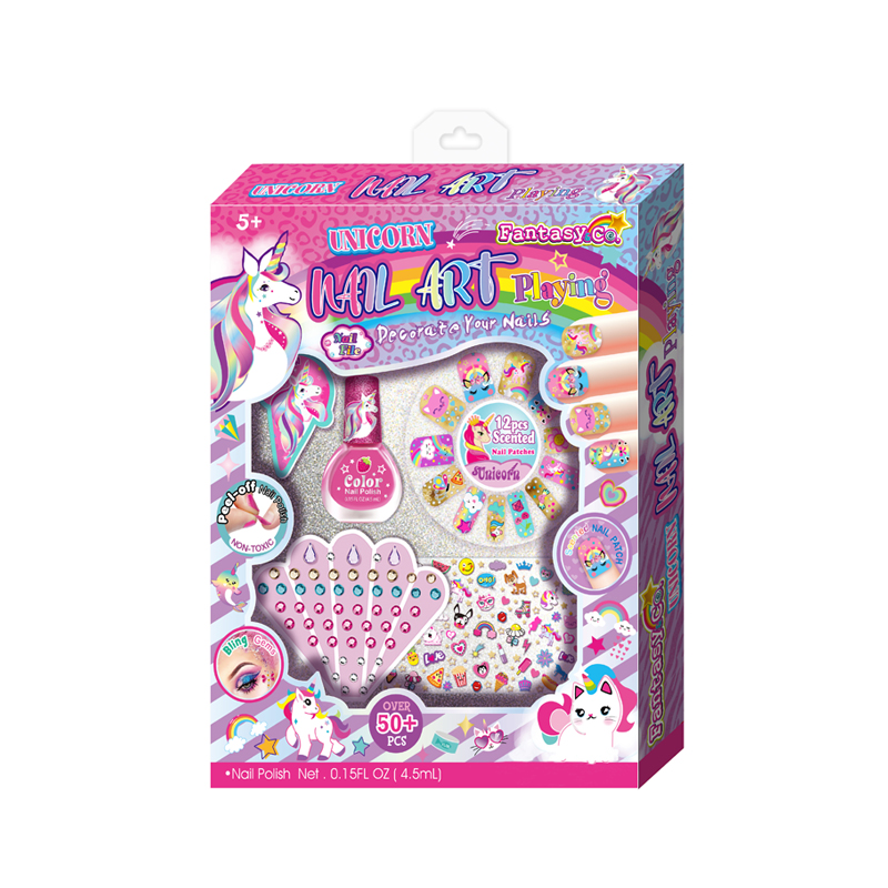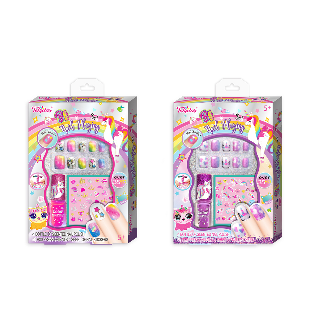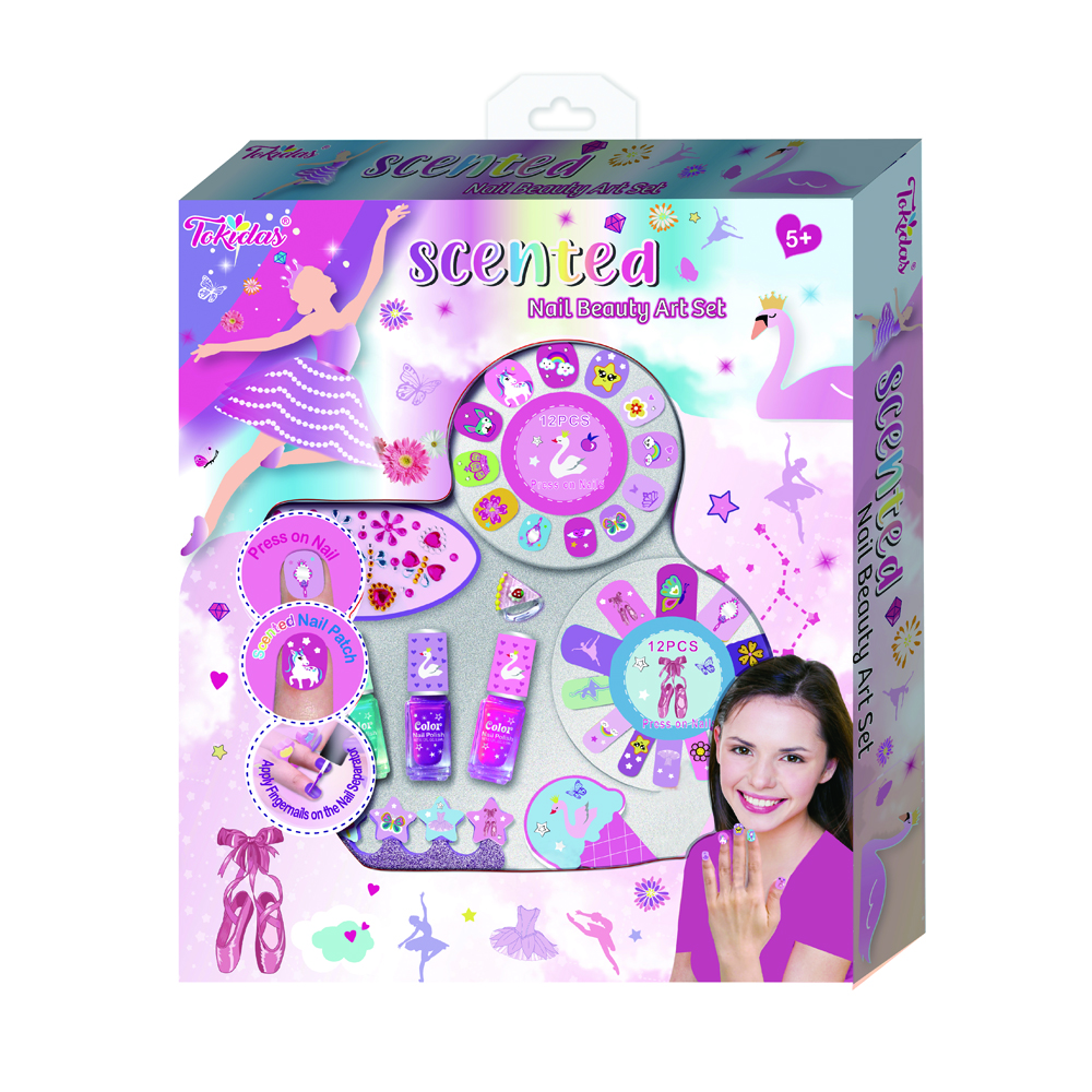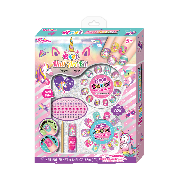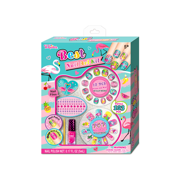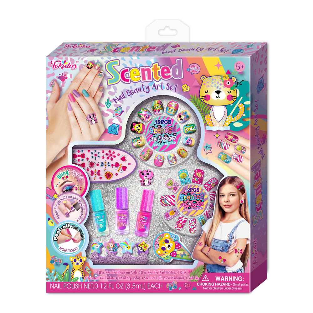 12 Nail Patches, 12 Pcs Press on Nails, 1 Nail Ring, 1 Sheet of Jewels, 1 Nail File, 1 Wooden Stick, 1 Bottle of Scented Nail Polish.