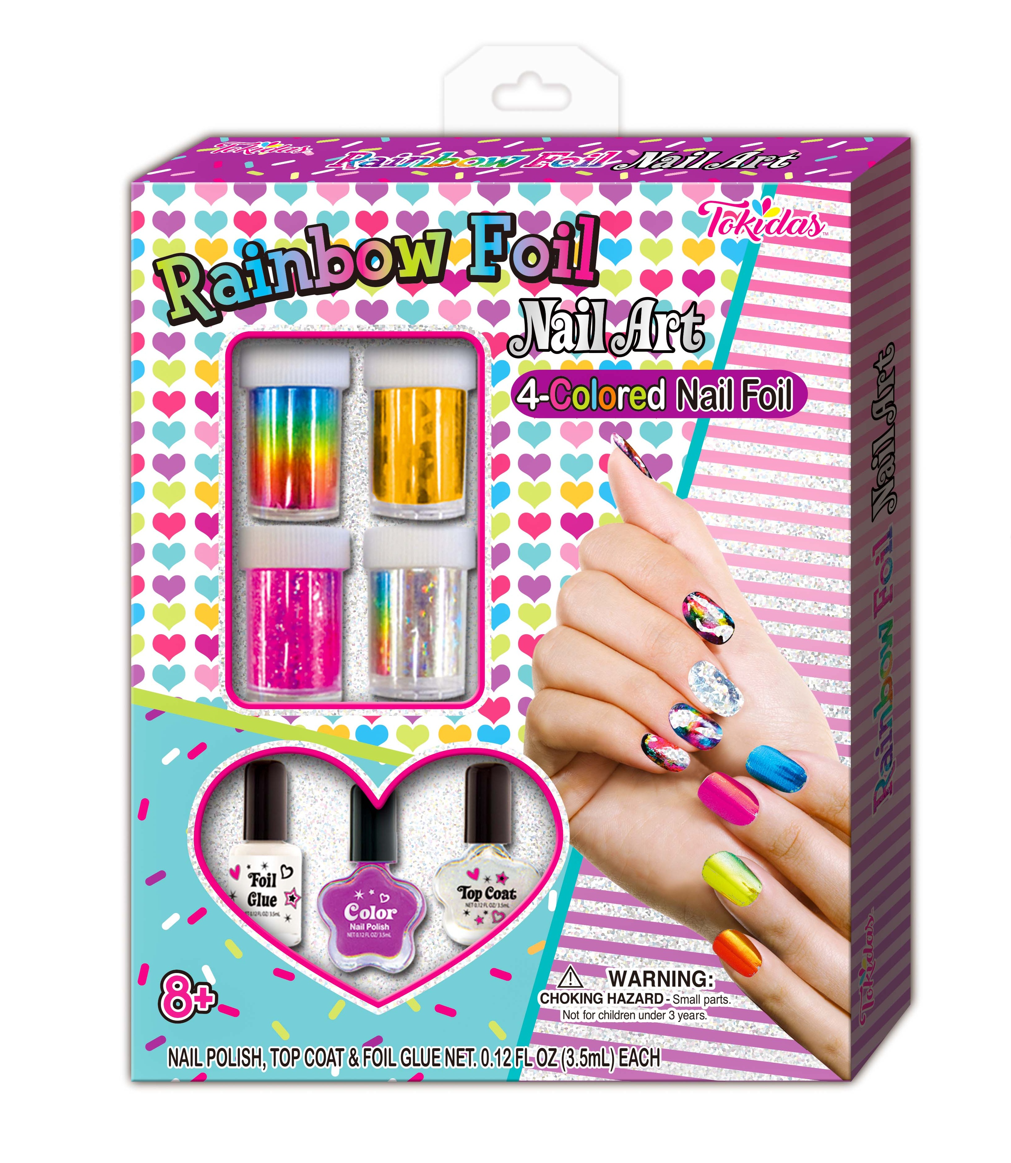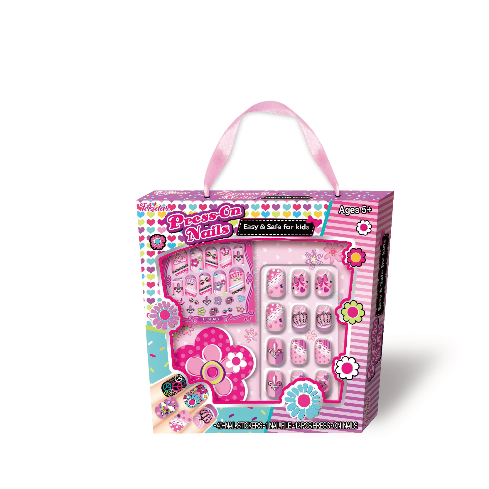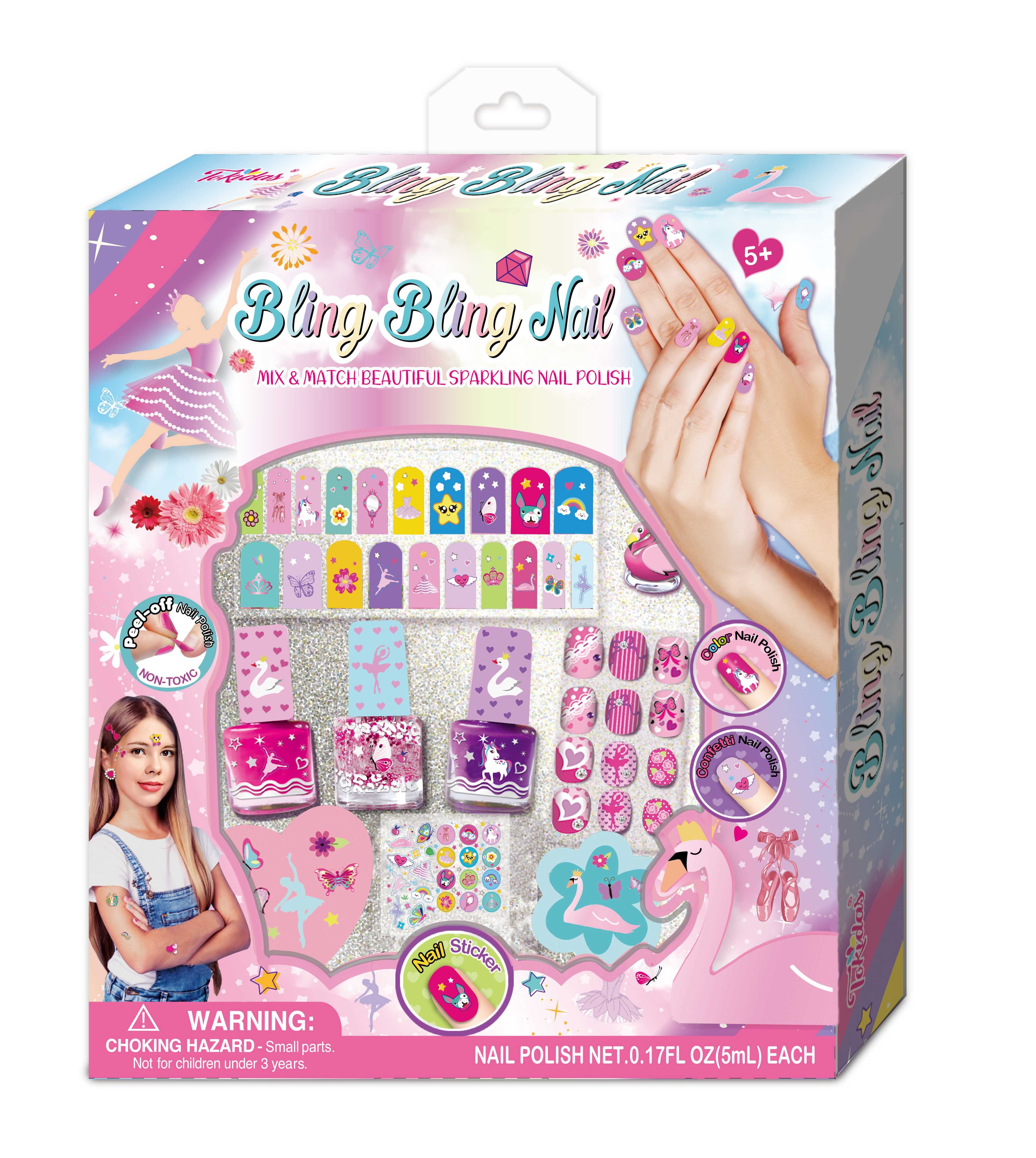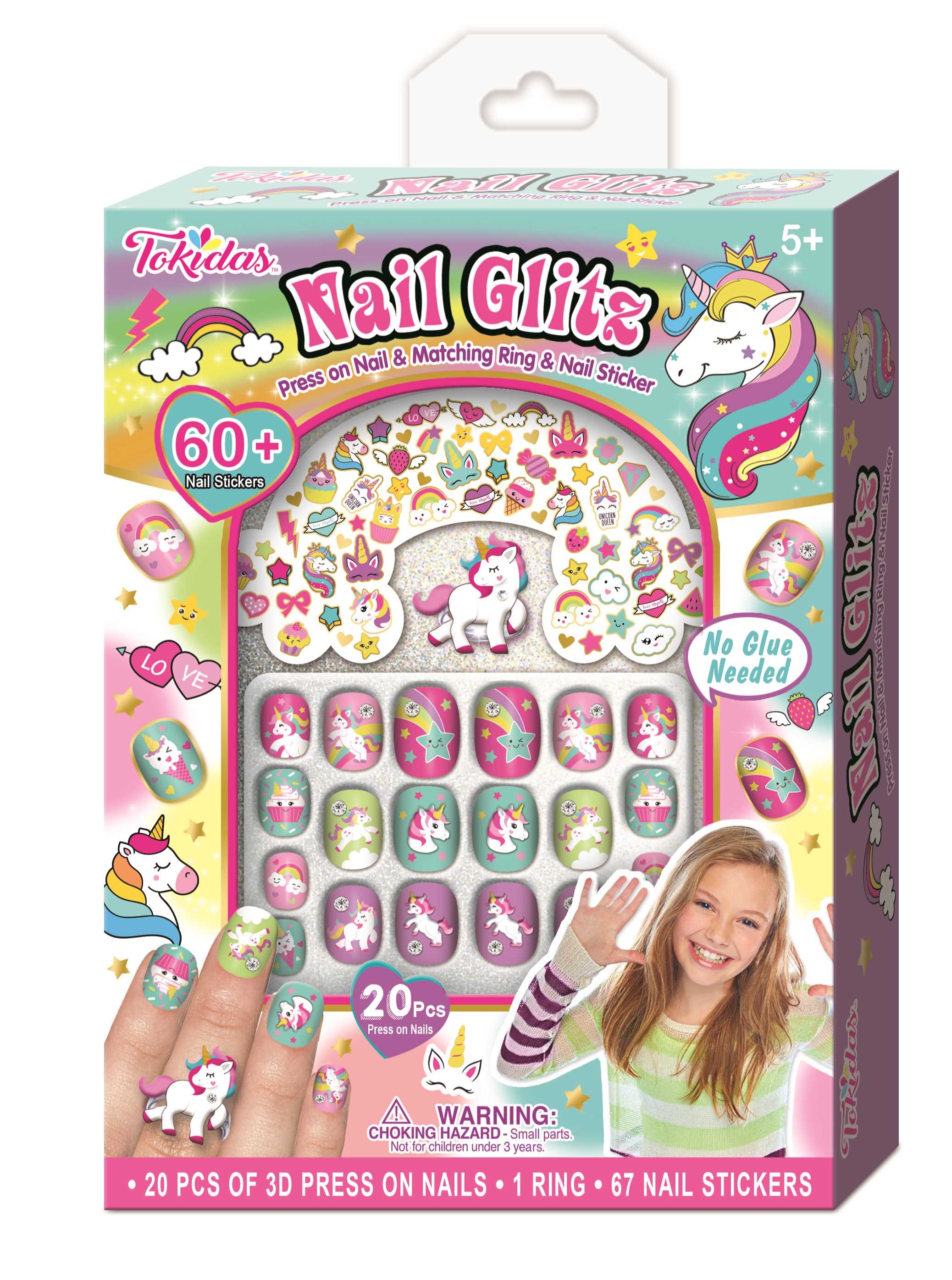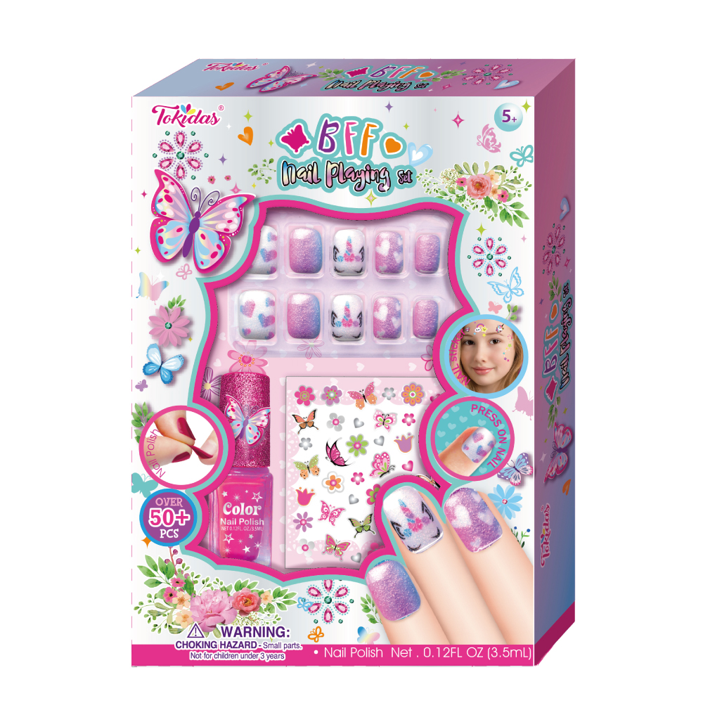 12 Nail Patches, 12 Pcs Press on Nails, 1 Nail Ring, 1 Sheet of Jewels, 1 Nail File, 1 Wooden Stick, 1 Bottle of Scented Nail Polish.
