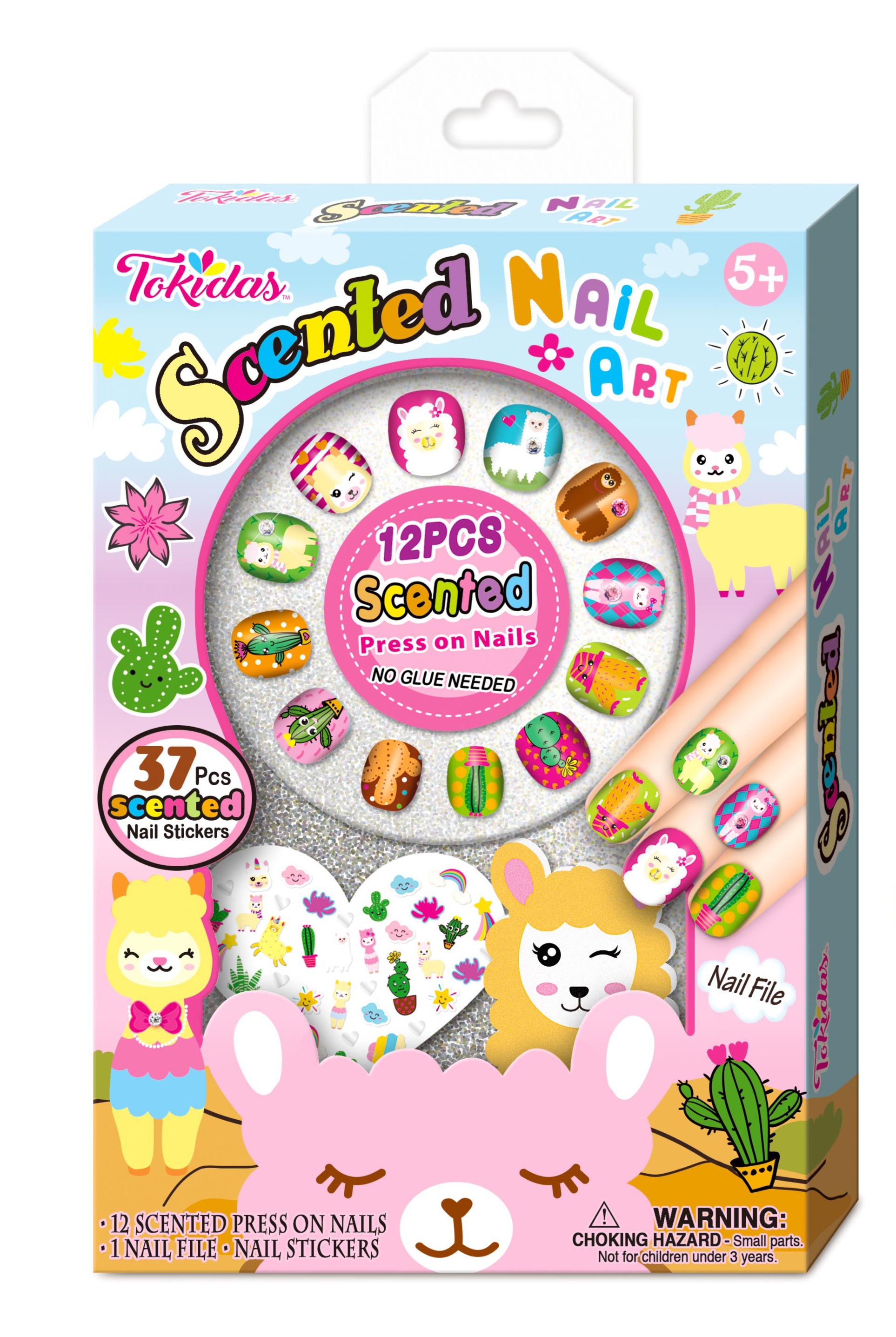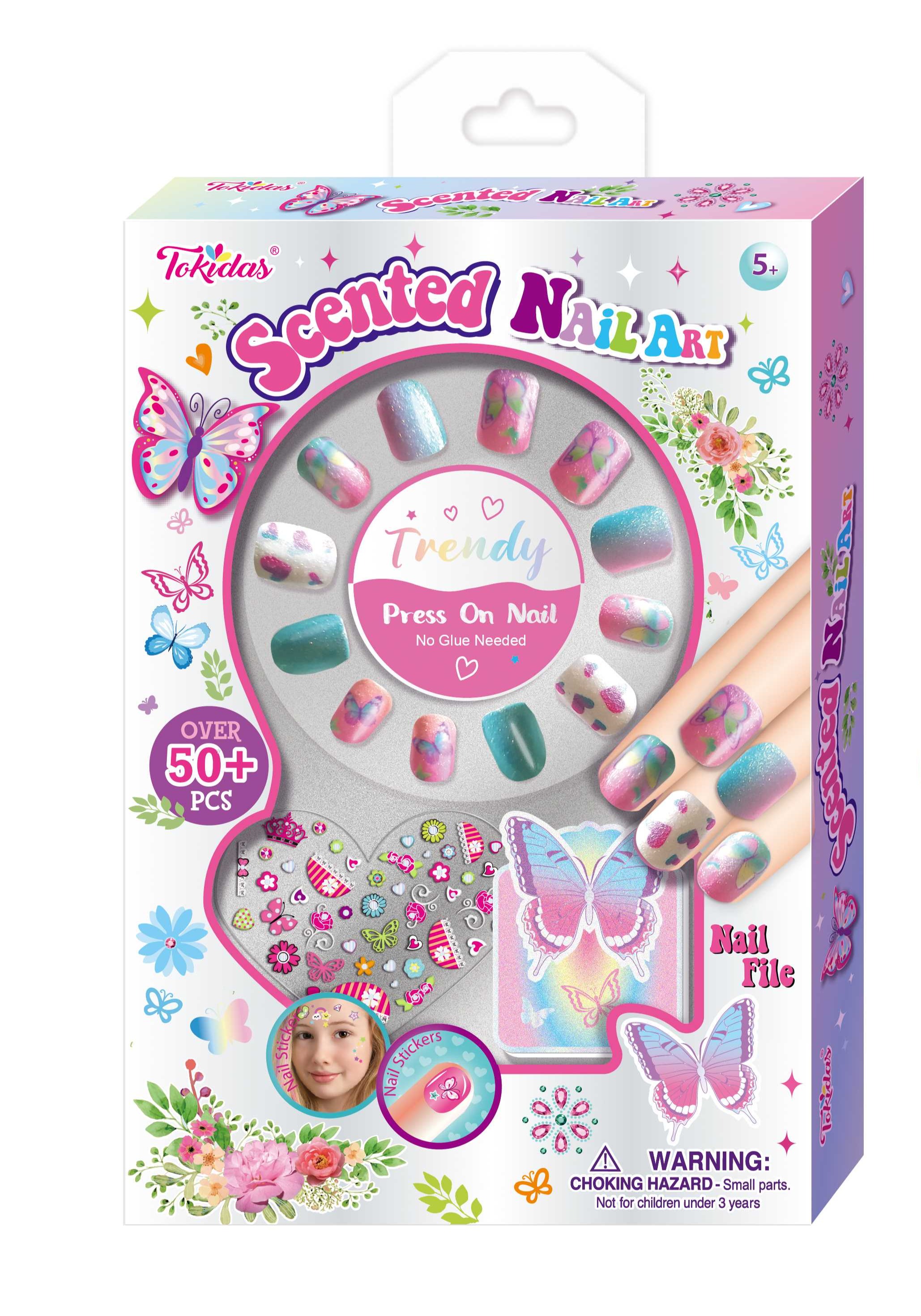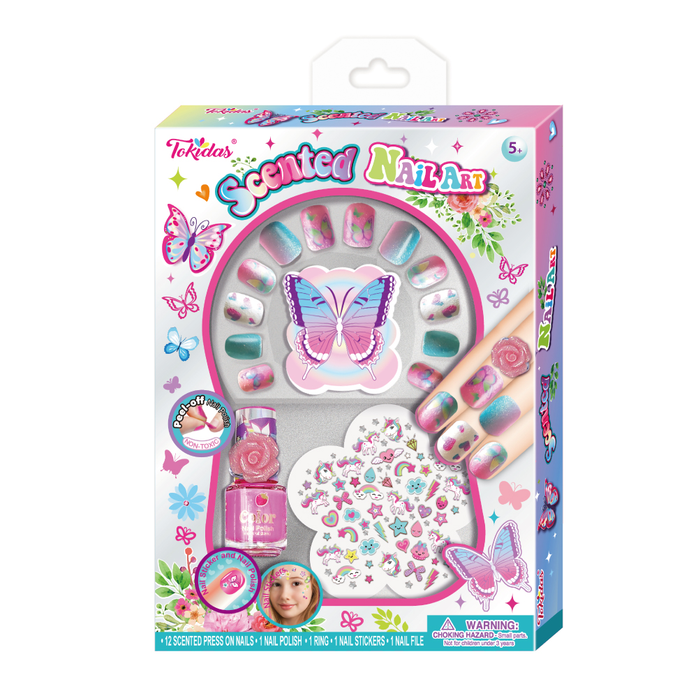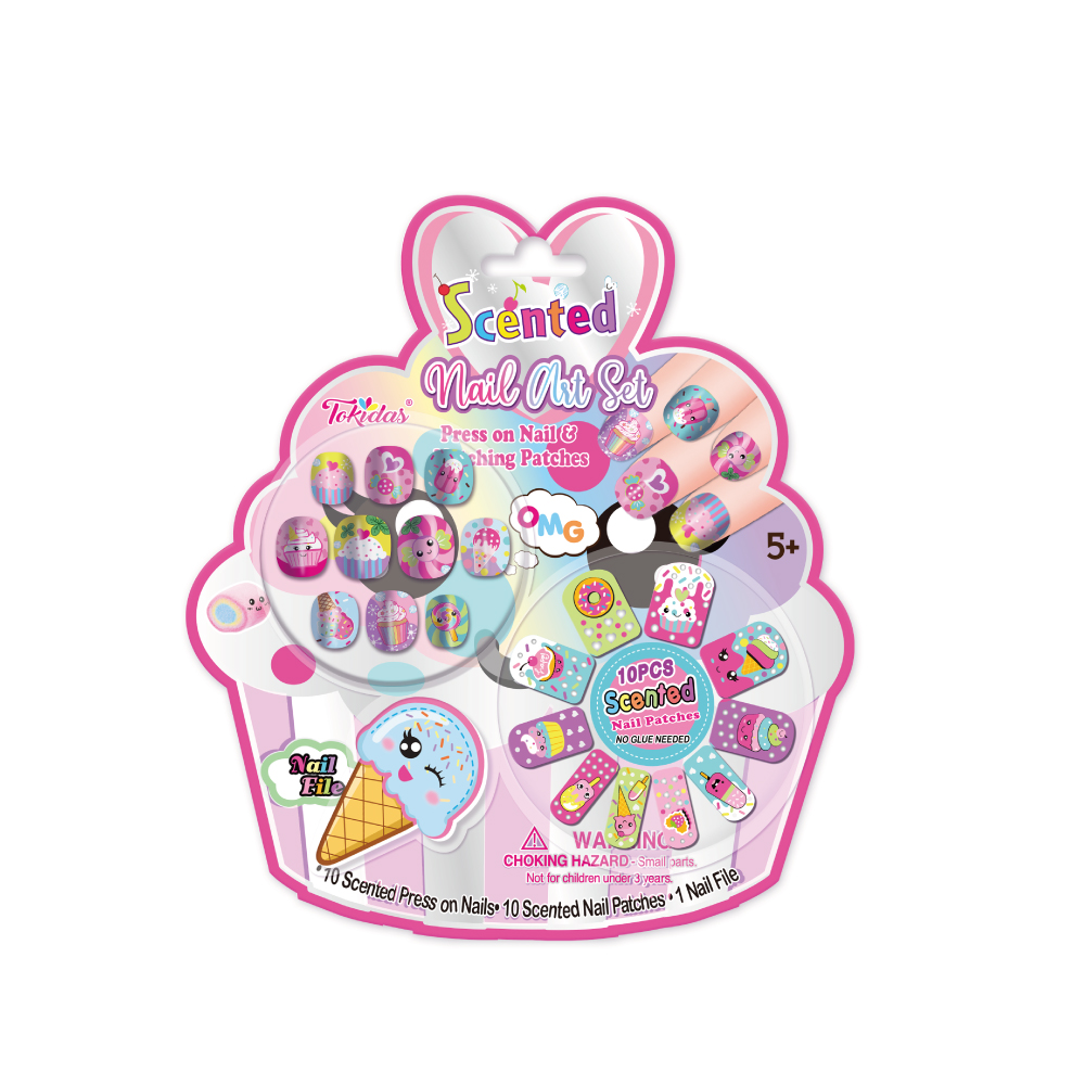 12 Pcs Scented Press on Nails, 12 Pcs Scented Nail Patches, 3 Bottles of Scented Nail Polish, 1 Nail Separator, 1 Patterned Gems, 1 Nail File, 1 Ring.