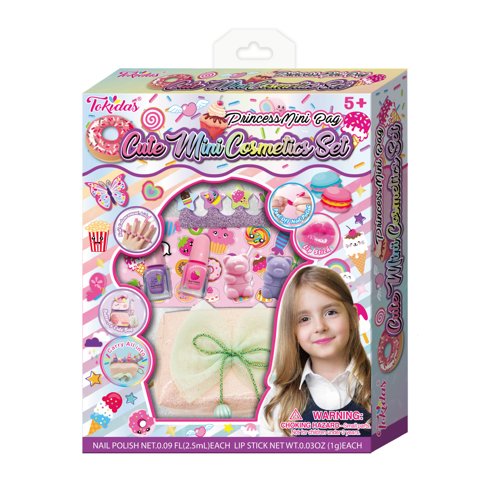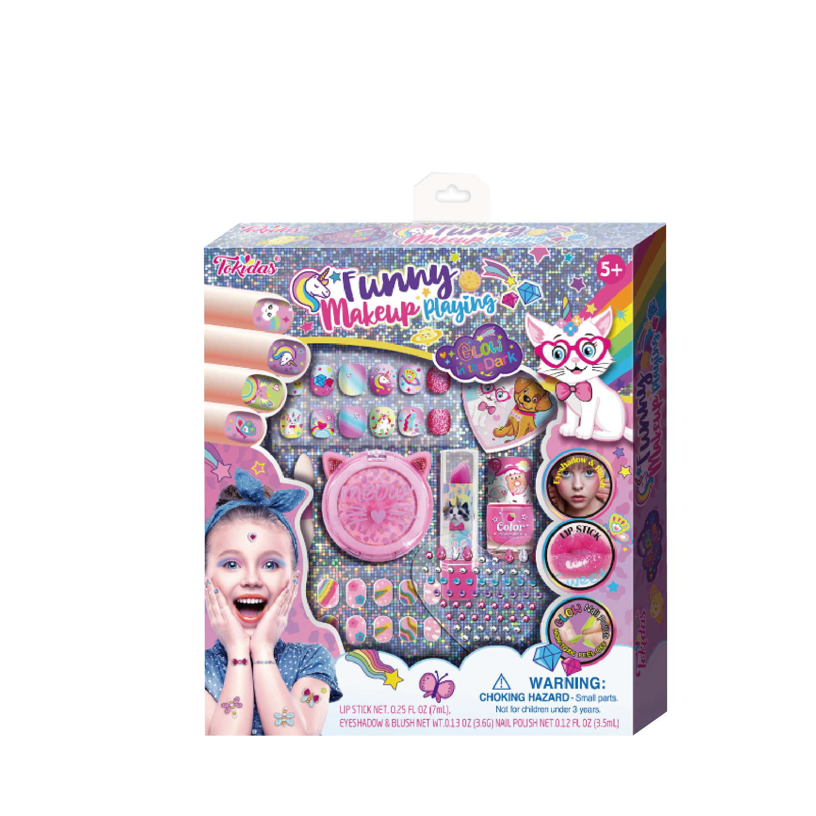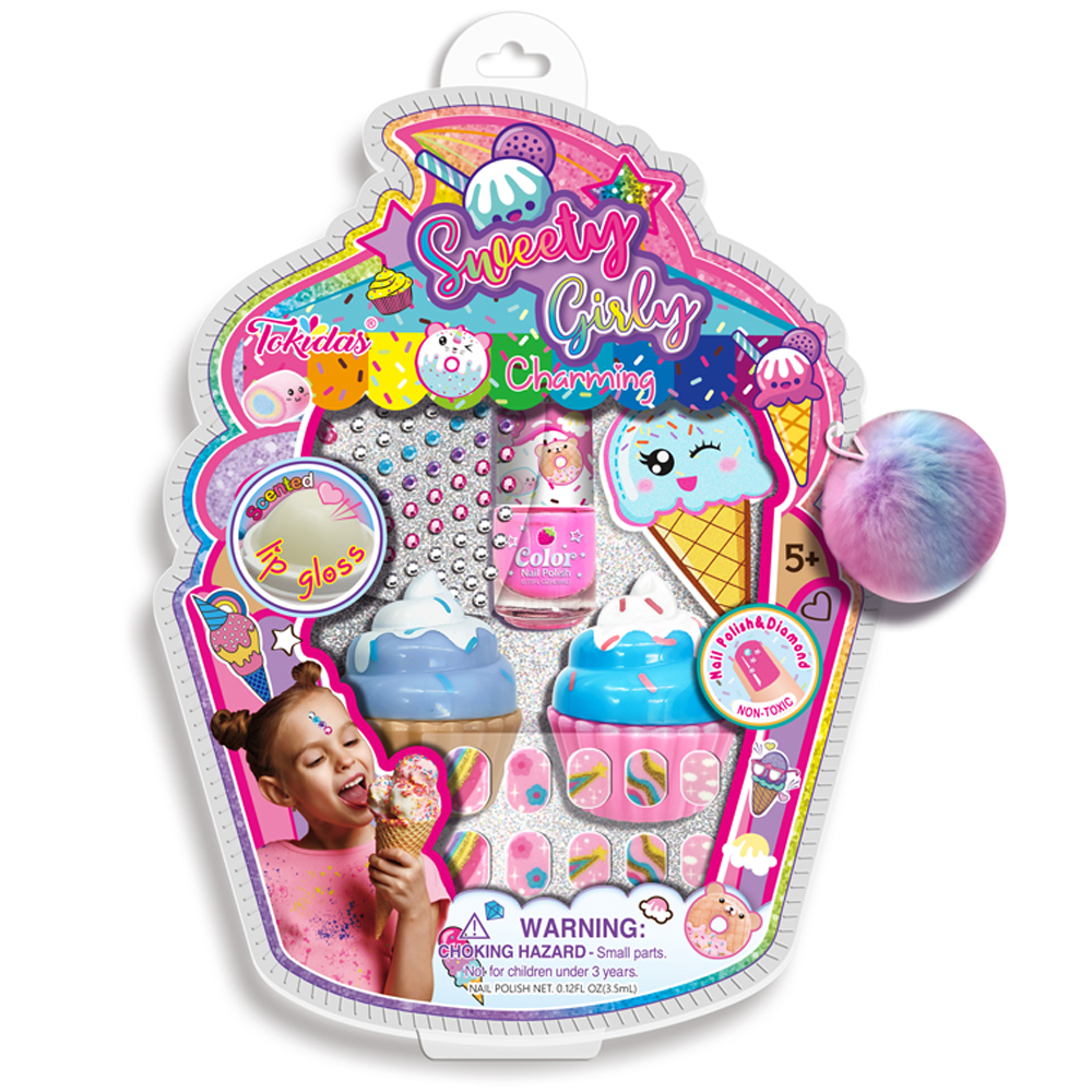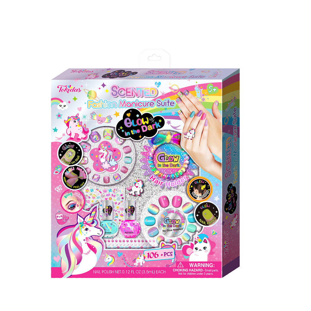 2 Moody Lipstick in Cake Cup, 1 Bottle of Scented Glow in the Dark Nail Polish, 1Hair Holder with Furcharming, 1 Sheet of Patterned Gems, 1 Sheet of Nail Patch.