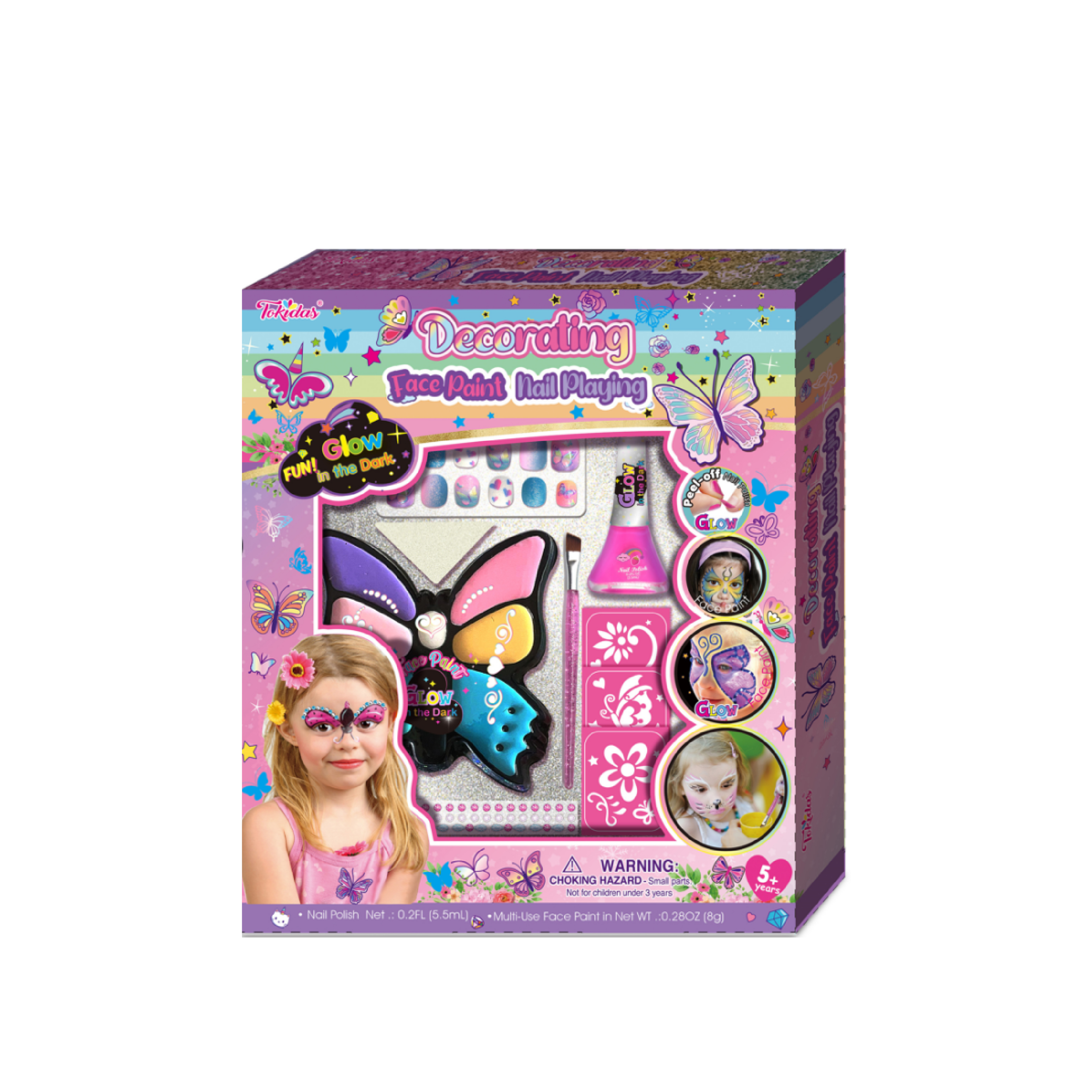 12 Pcs Glow in the Dark Press on Nails, 1 Multi-Use Face Paint in Butterfly Shape Palette, 1 Bottle of Glow in the Dark Nail Polish, 1 Sheet of Stencils, 1 Long Brush, 1 Sheet of Diamonds.