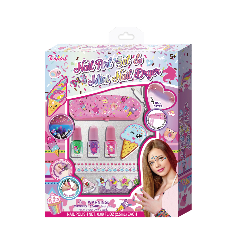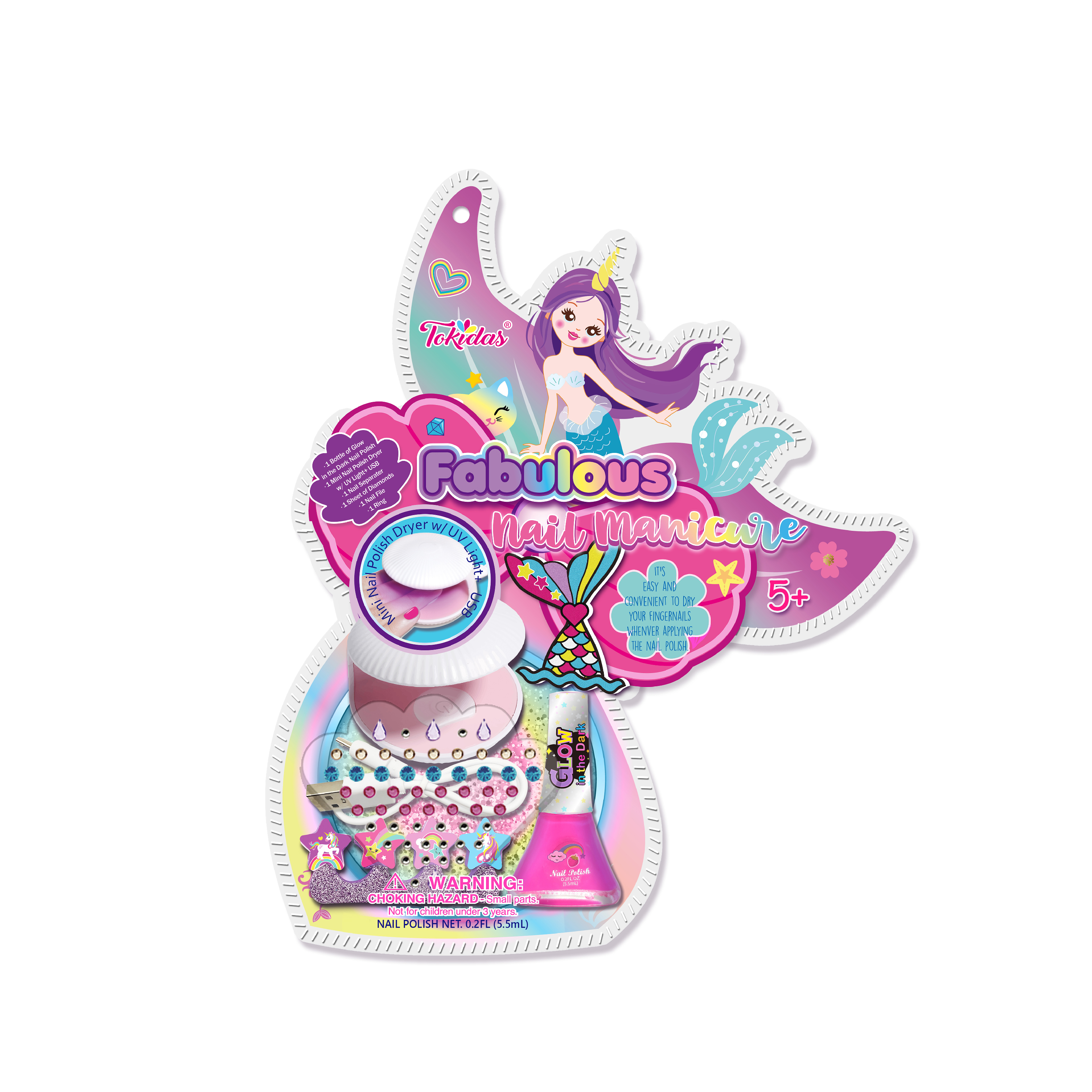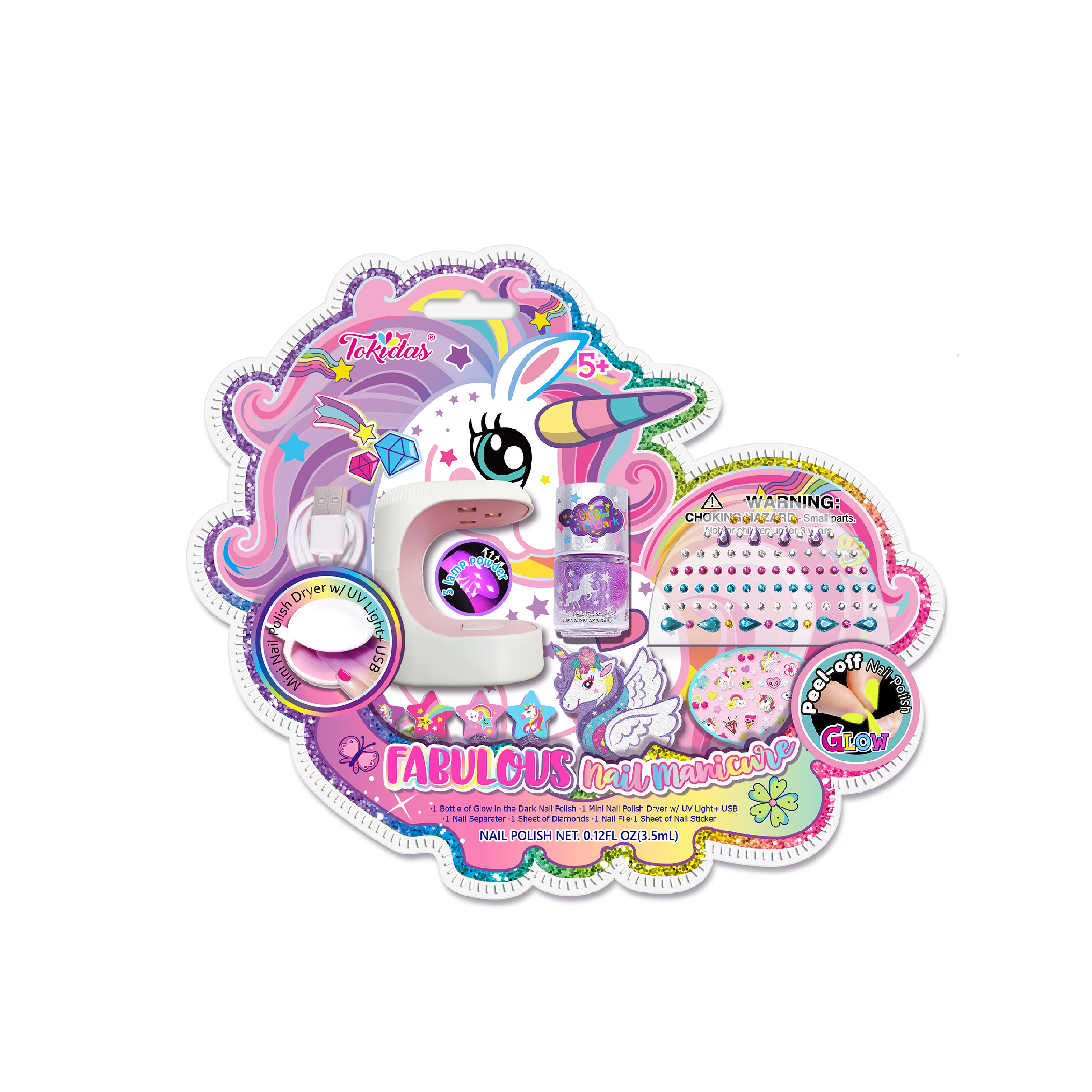 1 Bottle of Glow in the Dark Nail Polish, 1 Mini Nail Polish Dryer with UV Light+ USB. 1 Nail Separator, 1 Sheet of Diamonds, 1 Nail File, 1 Sheet of Nail Stickers.