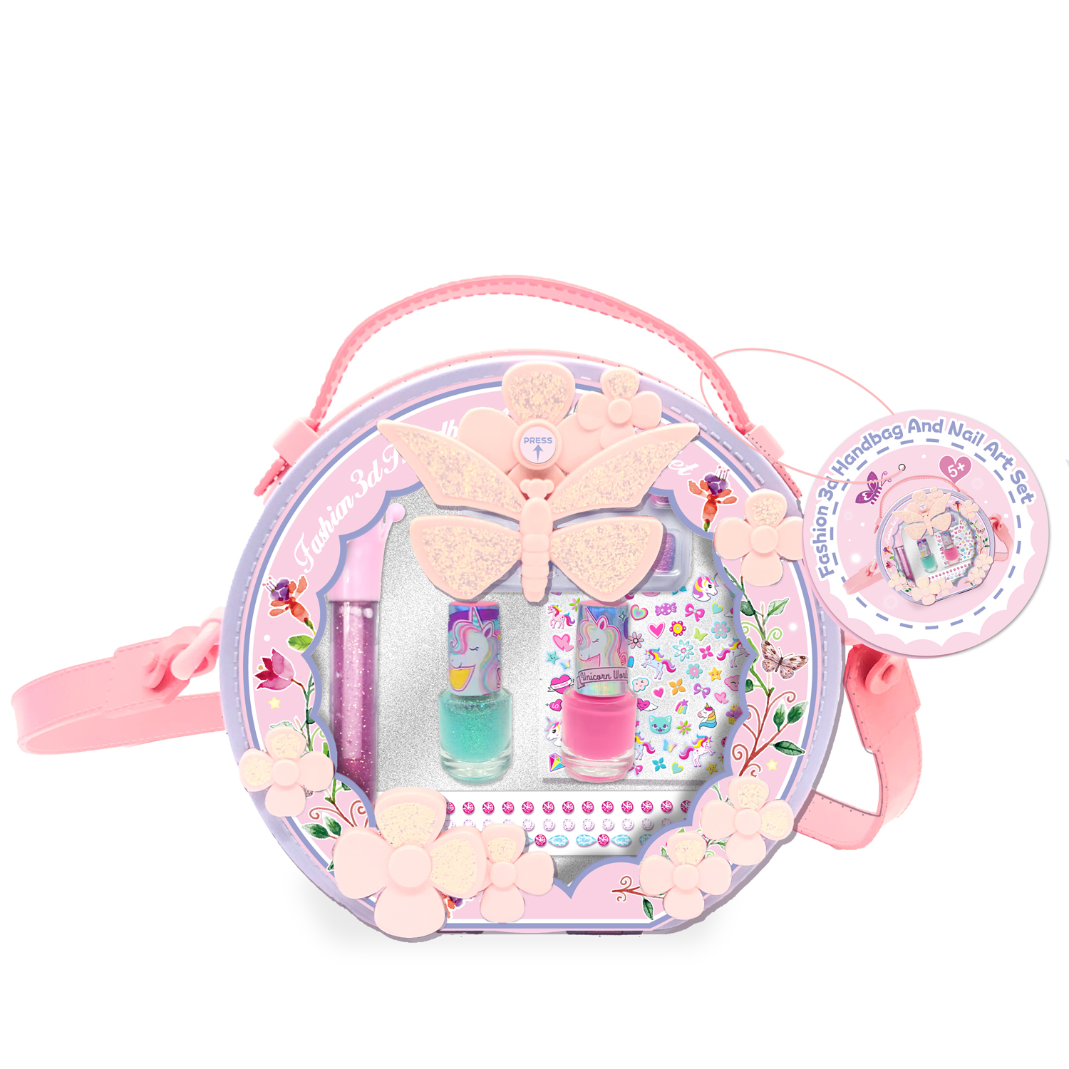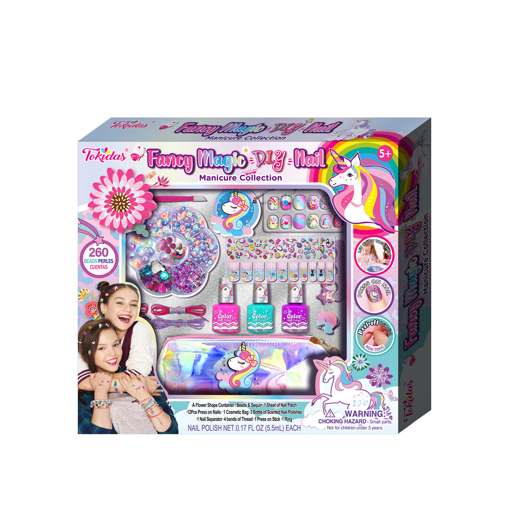 1 Flower Shape Container with Beads & Sequin, 1 Sheet of Nail Patch. 12 Pcs Press on Nails, 1 Cosmetic Bag, 3 Bottles of Scented Nail Polish, 1 Nail Separator, 4 Bands of Thread, 1 Press on Stick, 1 Ring.