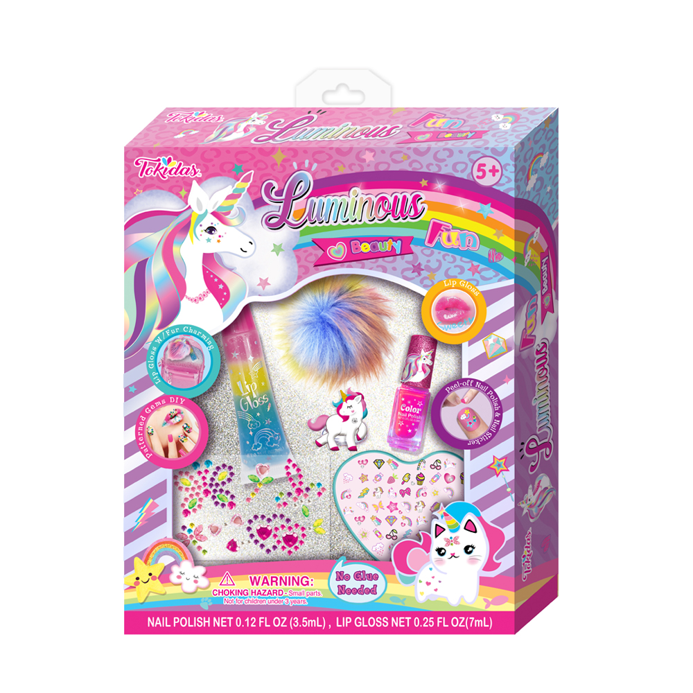 1 Bottle of Scented Nail Polish, 1 Glossy Lip Bomb, 1 Bottle of Luminous Highlighter with Roller, 1 Sheet of Glitter Tattoo Sticker, 1 Sheet of Patterned Gems, 1 Ring.