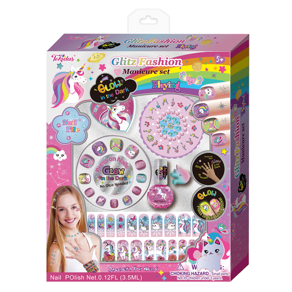 2 Bottles of Glow in the Dark Nail Polish, 1 Top Coat,12 Pcs Glow in the Dark Press on Nails, 6 Color Sequin with Mini Case, 1 Nail Separator, 1 Sheet of Gems, 1 Nail File with Key Chain, 1 Picky Stick.