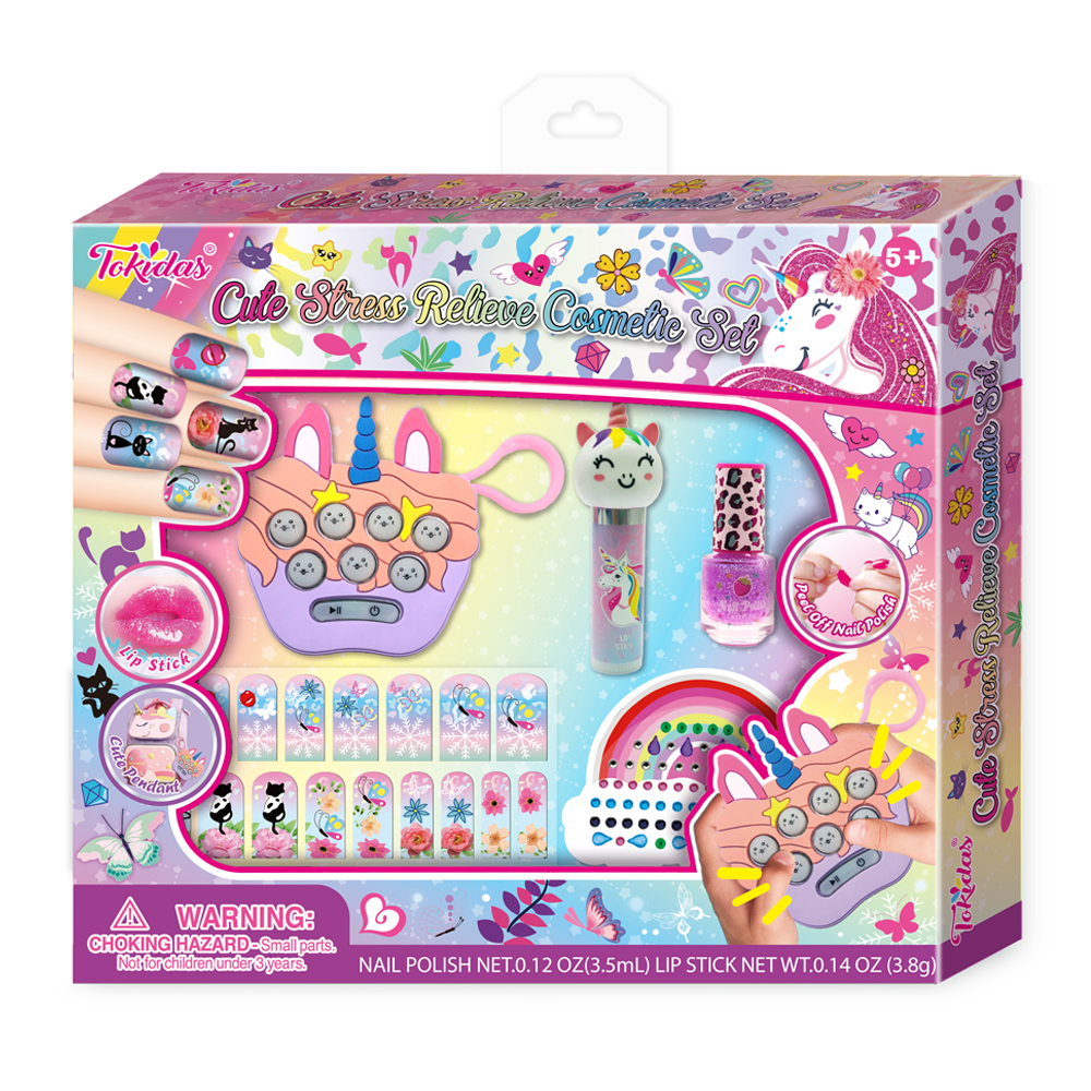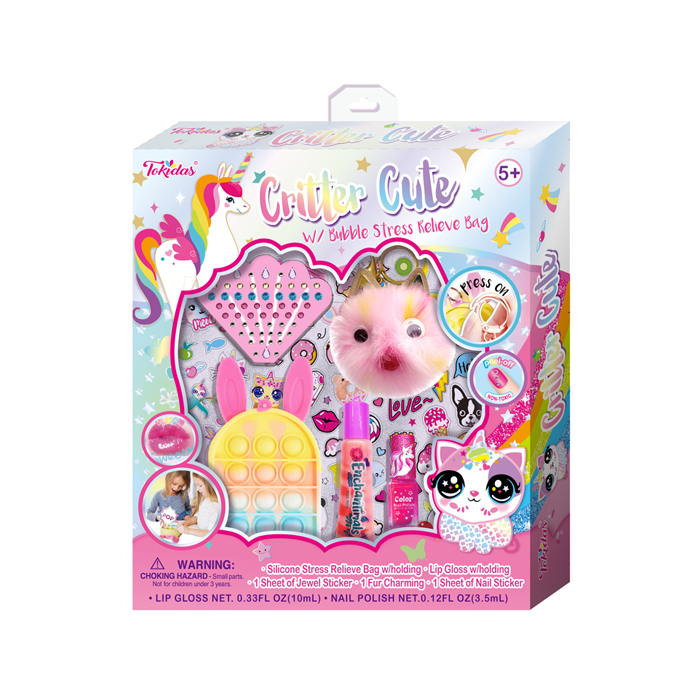 1 Silicone Stress Relieve Bag with Holding, Lip Gloss with Holding, 1 Sheet of Jewel Sticker, 1 Fur Charming, 1 Bottle of Scented Nail Polish, 1 Sheet of Scented Playing Stickers.